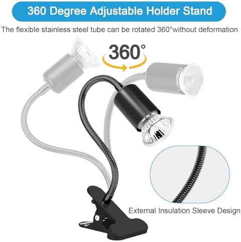 Lampa z zaciskiem do 25 mm z dwiema żarówkami 25/75 W. Timer cyfrowy 1-12 godzin co 30 minut. Regulacja ciepła 20-100% pokrętłem. Obrotowa głowica 360 stopni. Waży 650 gramów z kablem 2 m. Montaż na krawędzi terrarium w 40 sekund. Dedykowana do żab i gekonów. Czyszczenie wilgotną gąbką co 2 tygodnie. UVA/UVB 3% w żarówce 75 W. Temperatura pod lampą do 42°C.