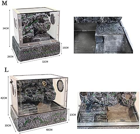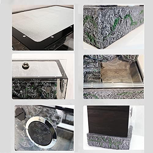 Terrarium 90 x 45 x 50 cm z szyb 6 mm i tarasem 35 x 25 cm. System drenażu z rurką 10 mm do 5 l. Mgiełka automatyczna 3 W co 2 godziny. Pokrywa z siatką 50 x 30 cm. Waży 18,2 kg z podłożem kokosowym. Montaż w 25 minut z instrukcją graficzną. Dedykowane do żółwi leśnych i kameleonów. Czyszczenie octem jabłkowym co miesiąc. Wilgotność 70-90% stabilna. Bez kamery w komplecie.